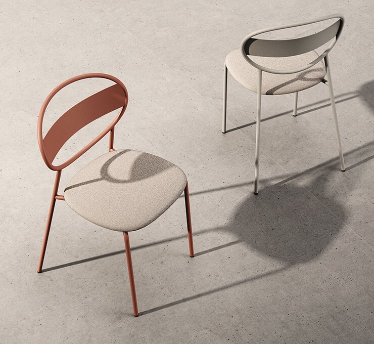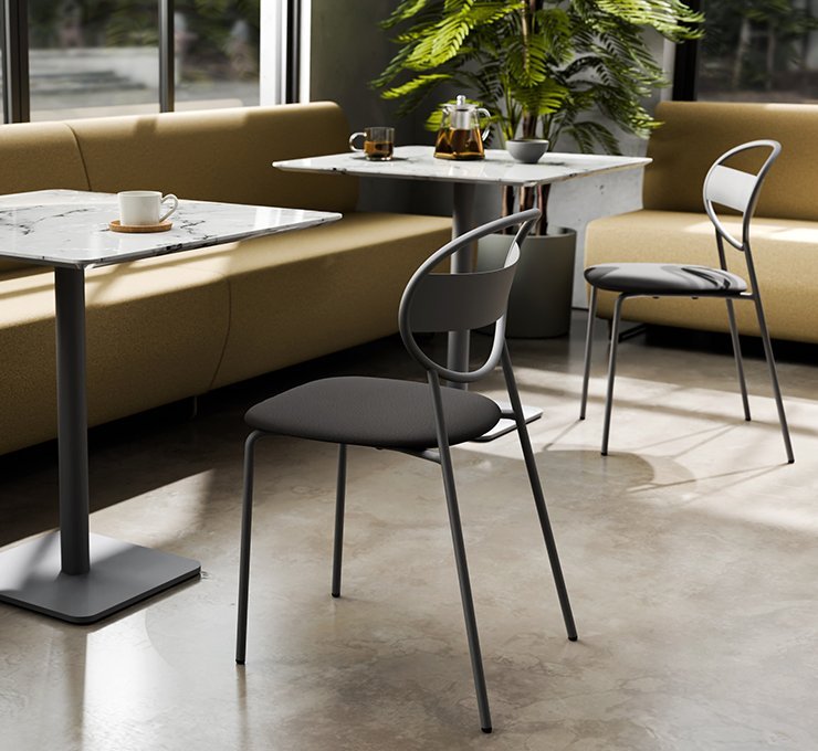 For outdoor use, Sole offers seat pads with UV protection that attach in place with discreet magnets. For indoor applications, a fixed upholstered cushion option is also available. Both options prioritise comfort while adapting to different environments and usage needs.